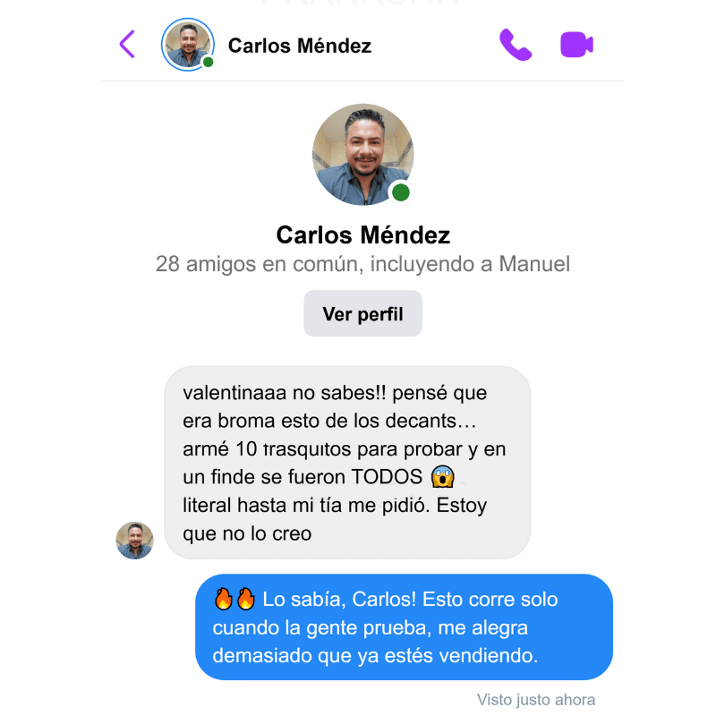 Hoy ayudo a personas en toda Latinoamérica a crear su propio negocio de decants, sin experiencia previa ni grandes inversiones.