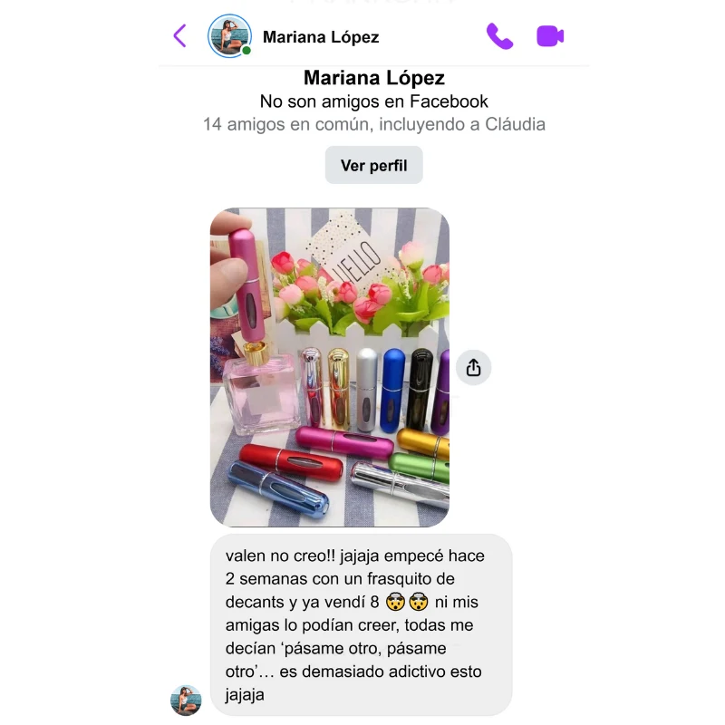 Siempre amé los perfumes, pero los árabes originales eran un lujo imposible. Al descubrir los decants, entendí que no solo podía disfrutar más fragancias, sino también convertirlo en un negocio rentable desde casa.